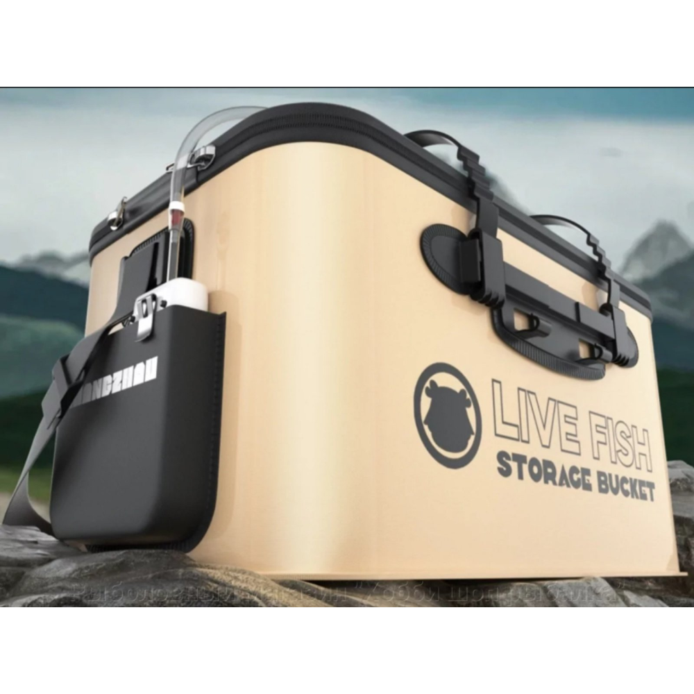 Сумку можна без проблем наповнити водою та заповнити рибою. Є можливість підключити кисневий, портативний компресор для насичення води киснем. Сумка обладнана складними, зручними відкидними ручками та додатковим ременем для перенесення на плечі. Сам матеріал EVA посилений, може витримати до 40 кг ваги, має поверхню, що не ковзає, і добре миється як всередині, так і зовні.
